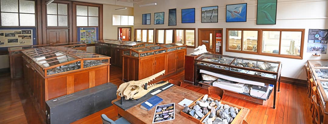 The University of Otago Geology Museum’s rock, mineral and fossil collections highlight the rich geological history and the evolution of marine and terrestrial biodiversity in Aotearoa New Zealand. Founded in 1869, the University of Otago is New Zealand’s oldest university, and collections date back to the 1870s when Geology and Paleontology were first taught. The Geology Museum has occupied its present site in the Geology Building since 1926 and is used for teaching, research and public engagement. The fossil collections are the pinnacle of the museum, comprising 60,000 catalogued specimens. Fossils of international significance include type specimens of endemic whales, dolphins, sharks, billfish, turtles and penguins (Robinson et al. 2024). Key freshwater animals include all of the world’s Galaxiidae fossils, the only Southern Hemisphere eel fossils, and fossil crayfish and mussels. Thousands of marine invertebrates ranging in age from Cambrian to Recent include holotypes of corals, brachiopods, clams, snails, ostracods, crabs, lobsters and sea urchins, mostly from the South Island of New Zealand. Notable additions include most of New Zealand’s fossils preserved in amber (Schmidt et al. 2018), and all plant and animal fossils, including a diverse array of insects, from the globally significant Foulden Maar (Lee et al. 2002).