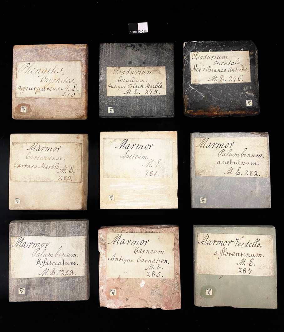 One hundred marble specimens were acquired in Rome in 1725326 by the Second Earl of Hopetoun during his Grand Tour, while the remainder came from his Scottish estates. The classifications were added in the 1780s by Rev. John Walker (173131803), the second Regius Professor of Natural History at the University of Edinburgh. Although influenced by Linnaeus, with whom he corresponded, Walker rejected reliance on visible traits such as colour and form for classifying “fossils” (then including minerals, rocks, ores, and organic remains). Instead, he based his system on the chemical properties known at the time, marking an important step in mineralogy’s development. The collection is the oldest confirmed suite of geological specimens at National Museums Scotland.