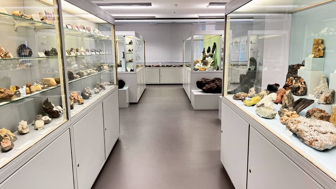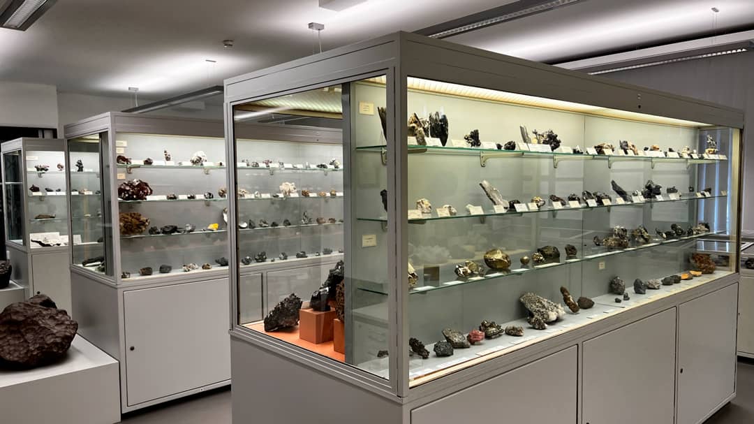 The Mineralogical Collections exhibit ~2000 Minerals in 8 central showcases (arranged according to mineral systematics after Strunz) and circular aligned cabinets showing further topics.