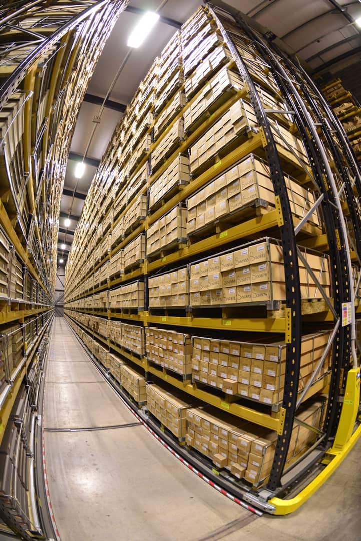 High density mobile racking is used to store the drillcore. A barcode retrieval system is in place to ensure findability of material. BGS © UKRI (P900643).